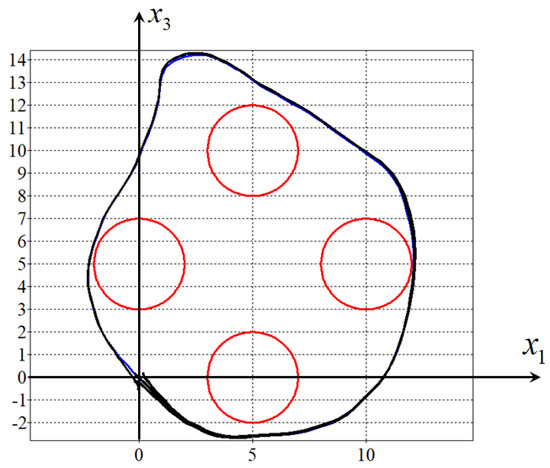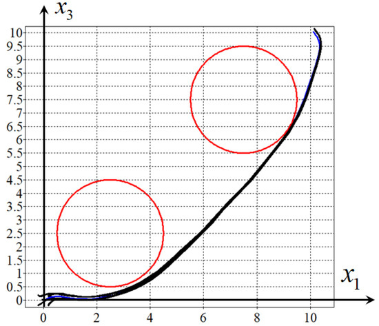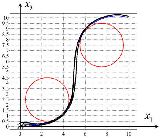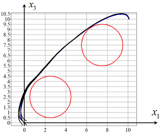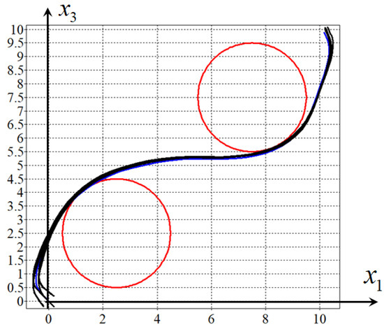 Figure 6, Figure 7, Figure 8 and Figure 9 show projections of one optimal trajectory (in blue) and eight perturbed trajectories (in black) from the domain of initial conditions (9). The figures show that the same stabilisation system (40)–(44) provides the object motion in the neighbourhood of all four optimal trajectories. It should be considered universal.