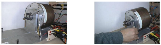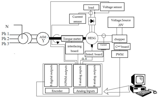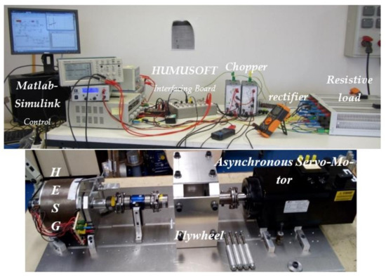The SATIE laboratory “Laboratoire Systèmes et applications des technologies de l’information et de l’énergie” [12] has developed a 3-kW hybrid excitation generator that can be used to power a wind simulator. As shown in Figure 2, a 6-kW asynchronous servomotor coupled with the HG replaces the wind, gearbox, and rotor of the turbine to create the wind emulator. MATLAB/Simulink and Humusoft [13] are utilized as monitoring and measuring tools, respectively.