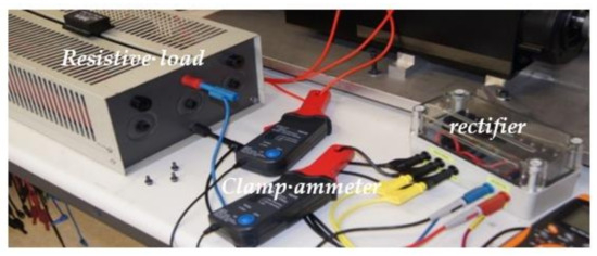 The operation can be described as follows: a three-phase autotransformer feeds a 6 kW ASM. This machine is mechanically coupled to the generator, which drives a resistive load of 15 Ω via an uncontrolled rectifier (Figure 4).