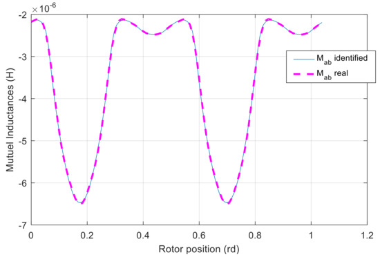 A sinusoidal voltage of frequency 50 Hz and adjustable amplitude is supplied to the stator winding. The detent torque of the HG is large enough to keep it stationary. The voltammetric method measures Ld, Lq, and M (as shown in Figure 9). The results of these tests are presented in Figure 10, Figure 11 and Figure 12. An approximate mathematical model is obtained through FFT analysis.
