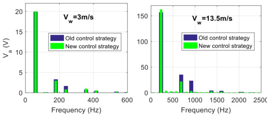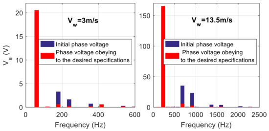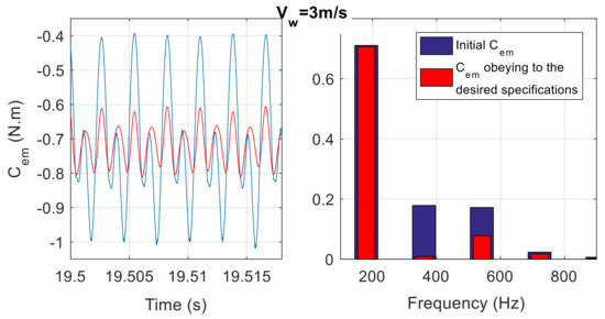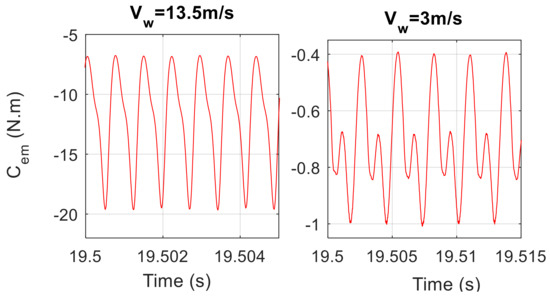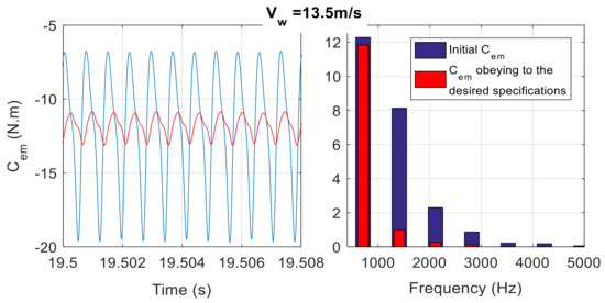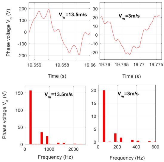 The stator voltages of the HG exhibit significant distortion. FFT analysis of the stator voltage is presented in Figure 13. The total THD is 27.32% for a wind speed of 13.5 m/s, resulting (a generator rotation speed of 239 rd/s), and it is 16.58% for vw = 3 m/s (Ωg = 62 rd/s). Therefore, the current structure of the generator produces highly oscillating electromagnetic torque (Figure 14), particularly at high speeds.