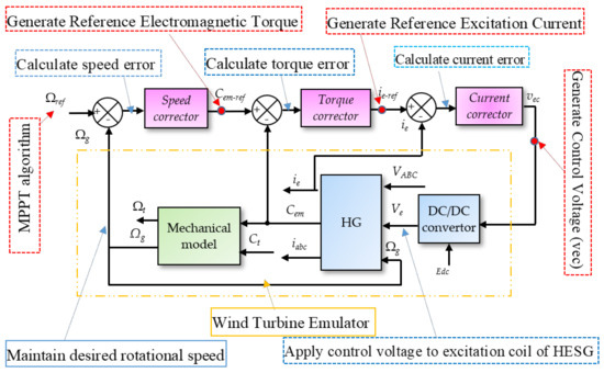 While these works have made significant contributions to torque ripple minimization, none of them treated the HG-based WECS. Additional hurdles occur in the case of Hybrid Excitation Synchronous Generators (HESGs), which display considerable nonlinearity due to the connection between rotation speed and excitation current. Robust control approaches, such as H∞ and CRONE regulators [8,9], have been used successfully in HESG-based systems to reduce the impacts of nonlinearities and uncertainties. These robust controllers offer greater resistance to disturbances and uncertainties.