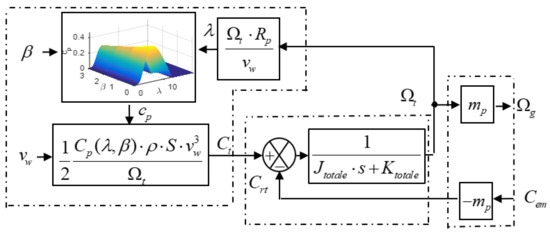 - The “current controller” block represents the regulator of the generator excitation current, and the “velocity controller” block includes the speed correction. The parameters of these controllers (current + speed) are pre-defined and saved in the workspace of the MATLAB software. The calculation of the different controllers was detailed in [8].