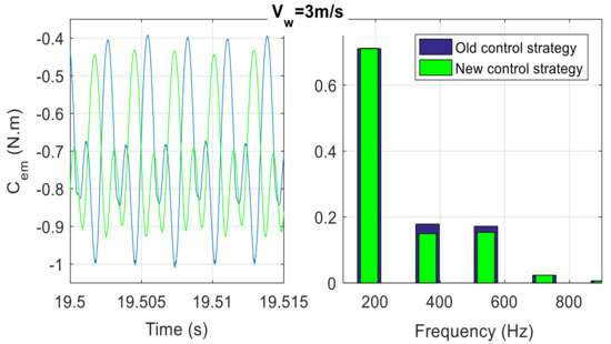 Two different approaches were evaluated for their ability to keep the harmonic distortion of the hybrid generator below the thresholds set by EN 50160. The first approach is passive filtering, while the second involves regulating the electromagnetic torque to dampen oscillations. The voltage harmonics of the generator are an integer multiple of the system’s frequency, which is proportional to the generator’s speed. Consequently, the rotor’s speed will fluctuate significantly around the chosen point of operation, and this will also affect the electromagnetic torque. In light of this, we will examine the electric harmonics and torque ripples in more detail.