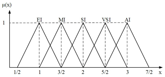 A pairwise comparison is performed for every design criterion against other remaining criteria as shown in Equation (2). In this context, the term “” elucidates the level of relative influence of the i-th element when assessed against the j-th element, with respect to the control criterion. This study uses the triangular fuzzy scale proposed by Kahraman et al. [142] as expounded in Figure 2. As can be seen, the linguistic variables are depicted in the form of triangular fuzzy numbers. In this study, there are five linguistic variables of equally important (EI), moderately important (MI), strongly important (SI), very strongly important (VSI) and absolutely important (AI). Their corresponding fuzzy numbers are [1/2, 2, 3/2], [1, 3/2, 2], [3/2, 2, 5/2], [2, 5/2, 3] and [5/2, 3, 7/2], respectively.