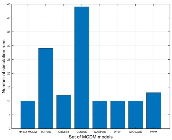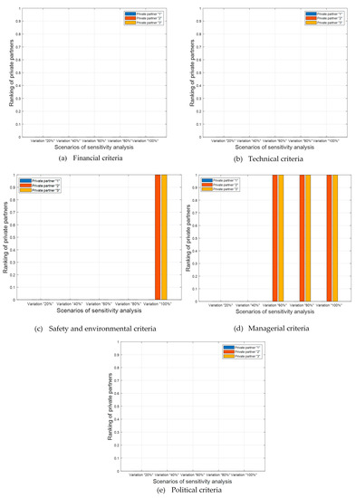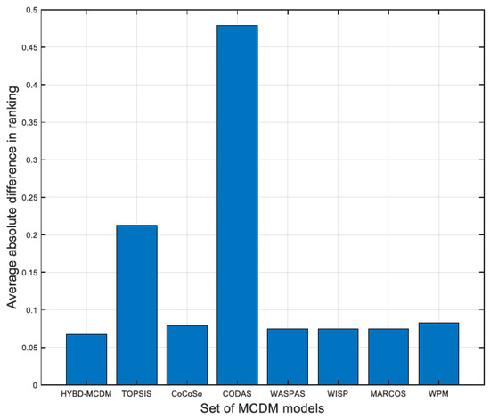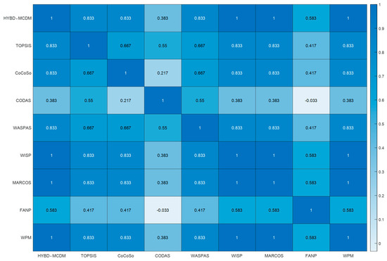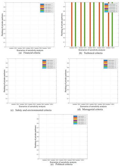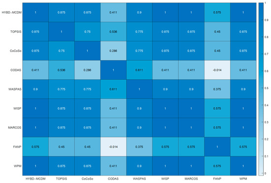 The symbol “NUM_MCDM” alludes to the number of used MCDM algorithms used in this research study. Hence, this research paper Copeland algorithm to blend the obtained rankings of seven MCDM algorithms into a final ranking of private partners. Copeland algorithm evinced its efficiency in dealing with complex and practical case studies such as evaluation of stormwater management alternatives [121], prioritization of road maintenance actions [122] and sustainability assessment of built environment [123]. The developed model is validated using four real PPP infrastructure projects in North Africa. The symbol “NUM_EX” alludes to the number of real projects tested in the present research paper. The correctness of the developed HYBD_MCDM is examined through three tiers. The first tier involves adopting Spearman’s rank correlation analysis to measure the similarities between the generated rankings from the investigated MCDM models [124,125,126]. In the second tier, the obtained rankings from the developed HYBD_MCDM model are compared against CoCoSo, WISP, MARCOS, CODAS, WASPAS, TOPSIS, FANP and weighted product model (WPM). The third tier incorporates performing sensitivity analysis to test the stability of the developed model against variations in the changes in the weights of PPP selection criteria.