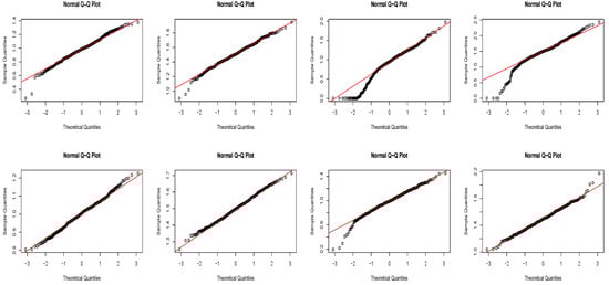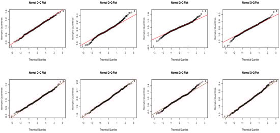 Figure 2 shows Q-Q plots of the estimators for and with , 200 and 0.9 by using the SCAD penalty function. The performance from Q-Q plots in this instance is comparable to that in Section 4.1. The asymptotic normality in Theorem 3 is verified as sample size rises because the Q-Q plots are more aligned with the normality; when the value of is increasing, the poorer imitative impact is observed.