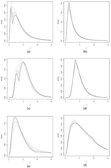 PDF of the LABPN model with parameter , for: (a) with (solid line), 2.5 (dashed line), 1.75 (dotted line); (b) with (solid line), 0.5 (dashed line), 0.75 (dotted line); (c) with (solid line), 2.5 (dashed line), 1.75 (dotted line); (d) with (solid line), 0.5 (dashed line), 0.75 (dotted line); (e) with (solid line), 2.5 (dashed line), 1.75 (dotted line) and (f) with (solid line), 0.5 (dashed line), 0.75 (dotted line).