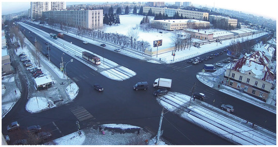 A software system was developed to collect data on the traffic flow structure and pollutant emissions. It analyzes the video stream from the road network section using neural network technologies. We analyzed the intersection of Prospect Pobedy and Krasnoznamennaya street in Chelyabinsk, Russia using a free-access Intersvyaz camera (Figure 1) [37]. This intersection was chosen because of the fairly good camera angle that allows us to view several queues of vehicles, a short distance that provides good visibility and allows us to detect and classify vehicles with high accuracy, and the absence of obstruction of view by poles and trees.