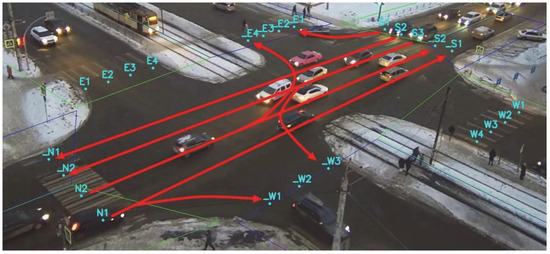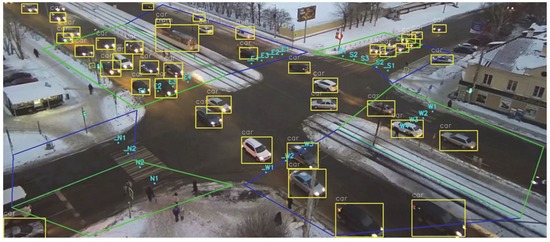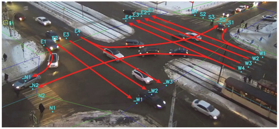 A functional zone was manually marked in the center of the intersection for calculations. We marked entry and exit zones with polygons and lines of points on the border of the functional zone. The points were placed approximately in the center of the lines in the section of the image in which vehicles can be tracked well to precisely determine the direction of movement. Each zone was named according to the cardinal directions: N, S, W, E for entry zones and _N, _S, _W, _E for exit zones. Each line was also named according to its zone and number (for example: N1, W2, _E3). To determine the entry and exit zone, we check if the object is in the polygon, and to determine the lane, we search for the point of the corresponding zone which is closest to the trajectory of the object. Figure 2 shows the operation of the system at a marked intersection.