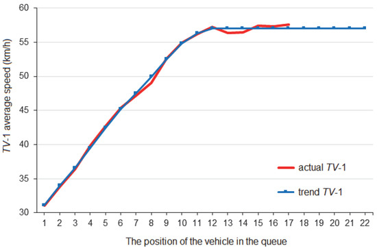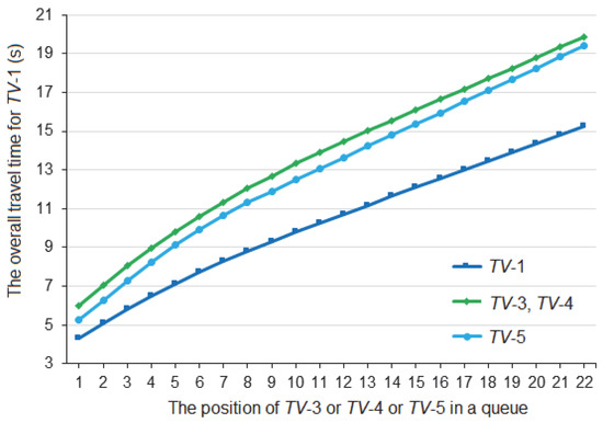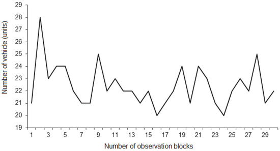 First, we should determine the characteristics of a homogeneous traffic flow consisting of vehicles of the first group (TV-1) (passenger cars) that prevail in the traffic flows of the analyzed intersection. Then, we should analyze the impact on these characteristics of vehicles belonging to other groups: group 3 (TV-3) (trucks weighing from 3.5 to 12 tons); 4 (TV-4) (trucks weighing over 12 tons) and 5 (TV-5) (buses weighing over 3.5 tons). Notably, this study does not consider group 2 (TV-2) vehicles (vans and minibuses weighing up to 3.5 tons), since previous study [43] have shown that they do not significantly change the temporal characteristics of the flow of vehicles belonging to the first group.
