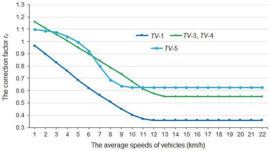 To understand better the field of estimates for the emissions calculated by Formula (13), Table 5 presents the ratios of PM2.5 emissions from a queue of an arbitrary composition to a full queue of 22 passenger cars taken as a unit.