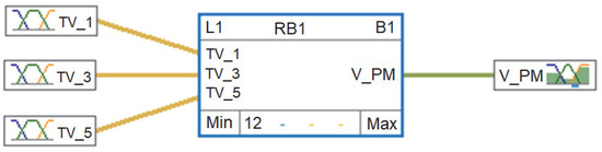 Let us consider the implementation of a predictive model based on the fuzzy logic method and the fuzzyTECH 8.77e software as the most general approach to estimating PM2.5 emissions in an intersection. The estimates of all variables are based on the calculated data from Table 2: the degree of increase in PM2.5 emissions due to the presence of vehicles of other groups in a queue of passenger cars is estimated V_PM; independent input variables include the number of vehicles from group 1 TV_1, group 3 TV_3, and group 5—TV_5. The block diagram of the constructed model is shown in Figure 21.