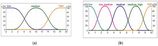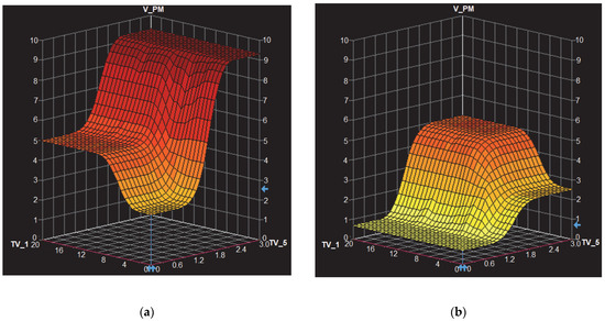 During fuzzification of variables, Gaussian membership functions were chosen as splines as they are most appropriate to state the problem stochastically. The parameters of the Gaussian terms were determined according to estimates taken from our practical work with surveillance camera data. Two terms are taken for the input variables TV_3 and TV_5 due to the small real range of their variations (up to 4 and up to 3, respectively); three terms with variations up to 20 are taken for TV_1. Five terms are taken for the output variable V_PM, with variations up to 10 according to Table 2. The distribution of values over the terms of the variables TV_1 and V_PM is exemplified in Figure 22a,b, respectively.