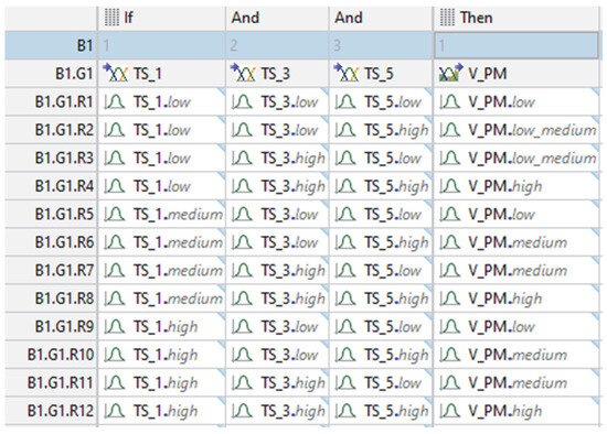 A fuzzy logic model for predicting V_PM values was defined by a table of its relationships with the input variables using the Spreadsheet rule editor block (Figure 23). Notably, anomalies related to inconsistency and consistency of the rules of relationships in the table are not considered at this stage. We plan to test fuzzy rules with a static and dynamic approach in our future detailed application of fuzzy logic methods.