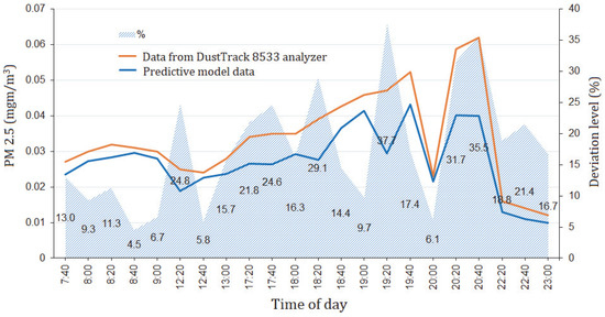 To verify the suitability of the developed air quality monitoring model, we conducted validation testing: the comparison of theoretical calculations for fine particle matter concentrations PM2.5 with field measurements obtained through the integration of data from the software system used by the “Center for Environmental Monitoring”, including an advanced particulate measurement device called DustTrack 8533 [44]. These preliminary estimates revealed an average 18% deviation between measured values and modeled predictions, likely due to local sources of pollution from nearby industrial activities within the city (Figure 25). Examining the trend over time reveals how actual pollutant levels tend to peak later in the day than anticipated by the model, resulting in greater differences between observed and predicted concentrations towards the end of the workday.