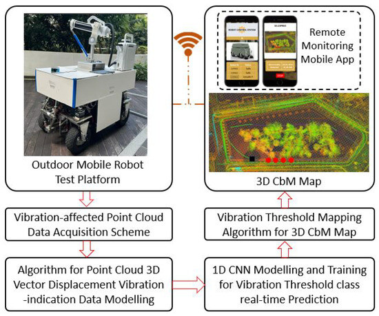 An automated condition monitoring (CM) strategy for outdoor mobile robots is essential to assure productivity and safety, considering extreme outdoor terrain features and faster system deterioration. Vibration is a key indicator of system failure and terrain abnormalities, especially in mobile robots. Hence, in this work, we proposed and validated a novel CM framework using a 3D LiDAR sensor, applying it differently than its typical use for navigation, by developing an algorithm to extract the vibration-indicated data from the point cloud, assuring low computation cost without losing vibration characteristics. We identified five vibration threshold classes for CM in outdoor robots considering both system deterioration and terrain conditions, namely safe, moderately safe due to system (M-S) and terrain (M-T), and unsafe due to system (U-S) and terrain (U-T). The algorithm computed cuboids for two prominent clusters in every point cloud frame, and the 3D vector displacement of the points set at the corners and centroid of the cuboid, which correspond to the vibration-affected clusters, are compiled as vibration indication data. A simply structured 1D-CNN-based vibration threshold prediction model is developed for fast, accurate, and real-time execution. Further, a 3D CbM map is generated by developing a framework to map the predicted anomalous threshold classes on the 3D occupancy map of the workspace in real time, which allows monitoring of the robot’s health conditions and uneven terrain features.