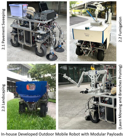 An in-house-designed autonomous wheeled mobile robot is used in this work for vibration-affected point cloud data acquisition for different threshold classes for 1D CNN training and real-time field case studies. The robot base platform is developed in a way to easily mount various modular payloads for diverse outdoor applications, such as pavement sweeping, fumigation or fogging (pest control), and landscaping applications, as shown in Figure 2, i.e., a vacuum motor–brush–bin assembly for pavement sweeping (Figure 2(2.1), a sprayer with tank assembly for fumigation (Figure 2(2.2)), and a grass cutting wire (lawn mowing), and a robotic biarm assembly (pruning branches) for landscaping applications (Figure 2(2.3)) are integrated for specific outdoor applications. However, for the extensive data acquisition and field trials of this study, we used the fumigation robot (Figure 2(2.2)), as this robot has to traverse both pavements and grass fields to serve its purpose, ensuring all the potential extreme outdoor terrain features are covered and studied.