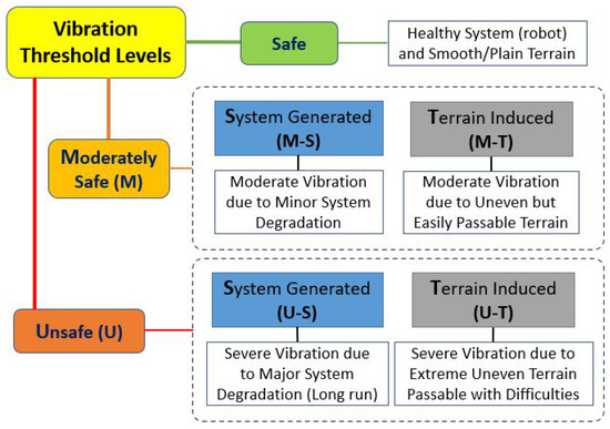 An outdoor wheeled mobile robot is generally designed in a ruggedized manner, anticipating uneven terrain, compared with an indoor mobile robot. However, the chances of system degradation or risk of hazardous operations are still high because of the unexpected and uncontrolled changes in terrain features, as explained in the problem statement section, especially while deploying the robot in autonomous mode. A wheeled mobile robot produces aberrant vibration as an early failure symptom, and its amplitude level depends on the system deterioration severity or the extremity of the terrain defects or undetected features. Hence, a vibration-level-based assessment or threshold level classification is a prerequisite to executing an automated CM system. Based on the robot design and application use cases furnished, the vibration threshold levels are broadly classified as safe, moderately safe, and unsafe. Further, the moderately safe and unsafe classes are classified based on the causes of vibration, either system-degradation-generated or terrain-induced. Hence, a total of five vibration-threshold-level classes are identified in this study for outdoor mobile robots, as illustrated in Figure 3. Here, the safe class is the acceptable vibration level, considering the robot is healthy and deployed at a smooth/plain terrain workspace. Moderately safe (M) is an acceptable class, but it is monitored as the condition may worsen faster. The unsafe (U) class advises not to continue the operations long term due to high chances of total system failure and operational hazards. The moderately safe vibration generated by the system (M-S) represents system deterioration, such as wheels wobbling, worn out or punctured wheels, etc., including unbalanced loading, and here, the exposed terrain is considered even and well-maintained. The moderately safe vibration due to poor terrain (M-T) class is due to uneven and undetected terrain features, which cause accelerated system degradation. Similarly, the unsafe system-generated (U-S) and unsafe terrain-induced (U-T) classes comparatively represent severe vibrations due to these distinguished causes.