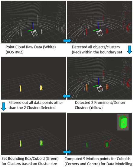 The Velodyne VLP-16 generates 3D images of the environment in 360 through 16 channels with a vertical field of view +15 to −15 by acquiring around 300,000 points per second. It is not computationally recommended to consider every point for modeling as vibration-indicated data for real-time deployment. The point cloud for any prominent objects in the environment will generally be denser than its background or small objects. Hence, we developed a fast and computationally low-cost method by creating a vibration-indicated data modeling algorithm without losing the vibration characteristics. Firstly, the algorithm set a boundary around the 3D LiDAR position, starting from 1.5 m and limited to 10 m for every scene and detected all object clusters within this range/boundary. Then, the two most prominent clusters were selected, and all other points adding a filter layer were removed. A bounding box (cuboid) is set for each cluster based on size. The bounding box motion corresponds to the cluster motion, which is directly related to the linear and angular motion of the robot due to changes in vibration threshold levels. Next, a point is computed at each corner and the centroid of the cuboid as motion points and the three-dimensional vector displacement of these points is tracked through every consecutive frame. As the motion of these points in 3D space corresponds to the vibration-affected robot’s motion, finally, the vector displacement elements of these nine points on the three axes from each cluster are extracted and modeled as vibration-indication data, as represented in Equation (1). The vibration-indicated data are extracted as [n × 3], where n is the number of motion points, and 3 is for the vector displacement data on three axes. Figure 5 depicts the steps to extract the vibration-indicated data from the point cloud, assuring low computation cost and representing vibration threshold classes.