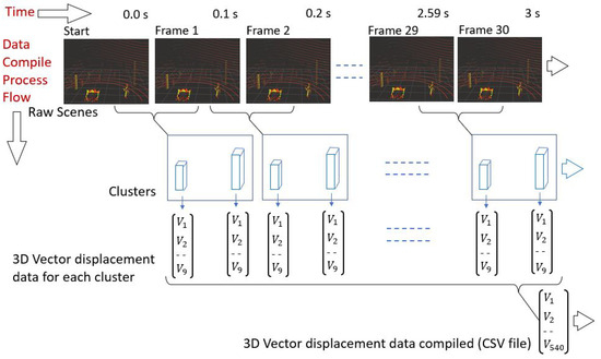 Further, the algorithm compiles the vibration-indicated data as follows. The 3D LiDAR data are subscribed at 10 Hz, i.e., every 0.1 s a new frame is generated. A total of 18 displacement points (9 points × 2 clusters) are formed from every two consecutive frames, each representing three axes elements. The sequential data collected from 30 frames, i.e., over 3 s, are treated as one sample of data for training and during real-time prediction, which is [540 × 3] and saved as a CSV file, as illustrated in Figure 6. The CSV files for each vibration threshold class are labeled for preparing the training dataset.