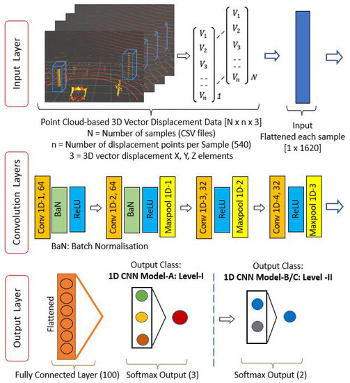 For better prediction accuracy, the training is conducted on two levels. Level I classifies the three higher classes—safe, moderately safe (M), and unsafe (U), saved as Model-A. Level II training is to find the cause of the undesired vibration, i.e., whether it is system-generated (S) or terrain-induced (T). Hence, for level II training, two models are developed; Model-B is trained to find the causes of the moderately safe class vibration, i.e., moderately safe due to system-generated/deteriorated vibration (M-S) or moderately safe due to terrain-induced vibration (M-T), and Model-C is for finding the causes of the unsafe class vibration, predicting U-S or U-T. Hence, based on the Model-A-predicted class (other than for the safe class), the algorithm will call either Model-B or C. More details of this two-level training approach are furnished in Section 4.2. The proposed 1D-CNN-based model structure to fit with the given point-cloud-based vector displacement data is illustrated in Figure 7.