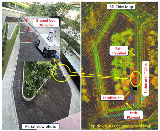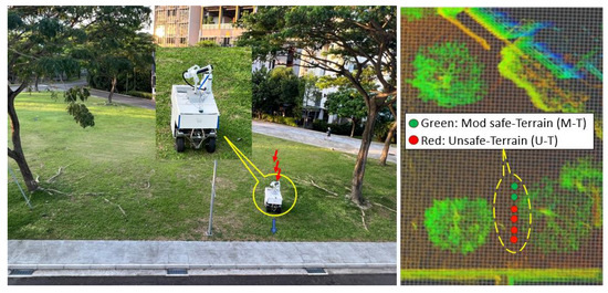 An open grass field at the campus was selected for the second case study, as well as an area of around 20 × 35 m2 for trial runs. The ground is almost fully covered by grass with regions of slops, small hidden pits, many ground-level stones of different sizes and shapes, and long, short, small, and big tree root sizes are spread out on the ground and mostly covered by grass. The robot was tested with a zig-zag pattern and we observed the robot’s behavior closely. The 3D CbM map initially showed an intermittent M-T and U-T class while traversing, especially on pits and roots. Whenever the robot hit bigger roots, jerks were generated and it tried to deviate from its planned path; simultaneously, the robot keept predicting the U-T classes. The power tripped once due to power surges from the motors while overcoming roots. As more unsafe classes due to terrain were predicted, we stopped the robot after one hour to avoid any permanent damage to the robot or hazardous events. The threshold classes fused based on some last sample data selected are shown in the 3D CbM map together with the test environment photo in Figure 14.