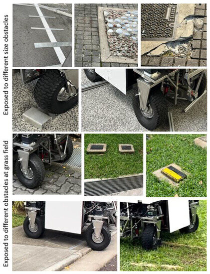 An outdoor mobile robot’s operational conditions and system degradation differ from indoor robots due to its extreme workspace nature. The current studies mainly focus on terrain classification using various sensors to classify terrain types using suitable AI models to conclude passable or impassable terrain. For example, in the study in [9], terrain classification of mainly asphalts, mud, gravel, and grass, based on magnitude frequency response on X and Y axis rotation and Z axis acceleration rate, is captured through an IMU sensor in an autonomous ground vehicle, using a Probabilistic Neural Network (PNN). A similar study using IMU sensor data on a wheeled mobile robot was conducted to classify typical outdoor terrain types adapting MultiLayer Perceptron (MLP) neural networks in [10]. Here, the authors also indicated a lower prediction accuracy of classes when using the accelerometer and gyroscope separately. Camera-based visual terrain classification for such terrain features was conducted in [11] using various texture-based descriptors and applying Random Forest (RF) as the classifier. An IMU-and-camera-based sensor fusion method was applied in the study in [12] to classify 14 types of terrain classes adapting Support Vector Machine (SVM), which also mentioned a faster classifier is needed for real-time prediction. Semisupervised learning with a positive Naive Bayes classifier was conducted in [13] using 3D LiDAR data for traversability analysis in outdoor mobile robots by defining the feature vectors with different dimensions. The study in [14] shows that 3D-LiDAR-based outdoor terrain classification is better under different lighting conditions due to its illumination-invariant property compared with the camera study, and both used RF as the classifier. These studies are limited to the terrainability or traversability of the robot without considering the internal system degradation level or assessing the safe threshold levels to continue the operation in a given workspace, which includes uneven and unseen terrain features. Also, the existing works do not consider ground-level negative obstacles, such as minor pits and gutters, which affect traversability and the robot’s health, which is crucial for CM, too. Besides, to assess the performance of the terrainability/traversability for extreme, uneven outdoor terrains, a ruggedized platform representative of real-world outdoor applications is necessary; however, it mostly uses a small, lightweight simple prototype with the required sensors mounted.