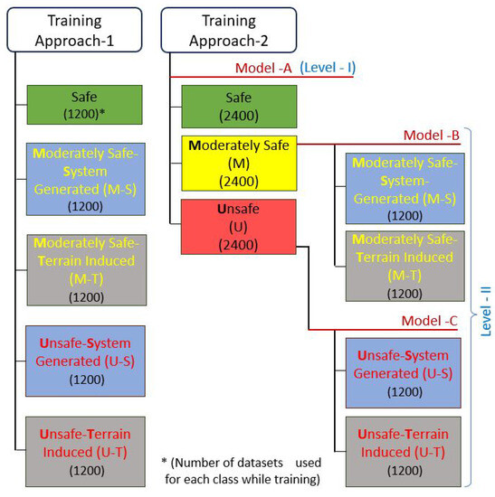We conducted the training in two approaches with the same dataset to decide on a better approach concerning the prediction accuracy of the five vibration threshold classes, following the same 1D CNN structure and parameters explained earlier. In the first approach (Approach-1), the model is trained using all five classes together in a single step, as usual practice. The second approach (Approach-2) is carried out by developing three models (Models A, B, and C), and the way the training dataset is complied for each model in the respective classes is explained as follows. (1) Model-A: All datasets are compiled for the three higher-level classes—safe, moderately safe (M), and unsafe (U). Here, all moderately safe threshold class datasets due to system or terrain are compiled together and labeled under M-class. Similarly, for U-class, all the unsafe threshold class datasets due to system or terrain are compiled together and labeled as U-class. (2) Model-B: Model-B only deals with the moderately safe class (M) training. The moderately safe threshold class datasets acquired from system or terrain causes are compiled separately and labeled as moderately safe–system-generated (M-S) and moderately safe–terrain-induced (M-T), respectively, for binary classification. (3) Model-C: Similarly, Model-C deals with training the unsafe class (U) to predict whether the unsafe class is due to the system (U-S) or terrain (U-T) by compiling and labeling only these particular datasets. For Approach-2, as per the prediction result of Model-A, the algorithm will call either Model-B or Model-C for subsequent prediction for the specific causes of vibration. Here, the final effective prediction accuracy is calculated based on the prediction probability of both Model A and Model B or C. Also, the total number of dataset samples used for each class for all the models during the respective training ensured the same thing. The training approaches, models, and configurations explored for selecting a better prediction approach are illustrated in Figure 11. Also, all the hyperparameters (as explained earlier) used during training for both approaches were the same, and the loss and accuracy plots for the selected approach (Approach-2 as detailed below) are shown in Figure 12.