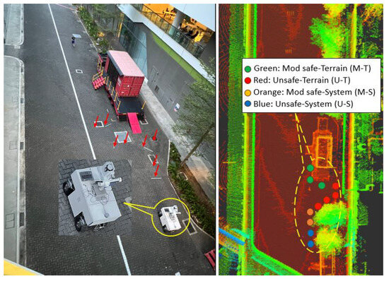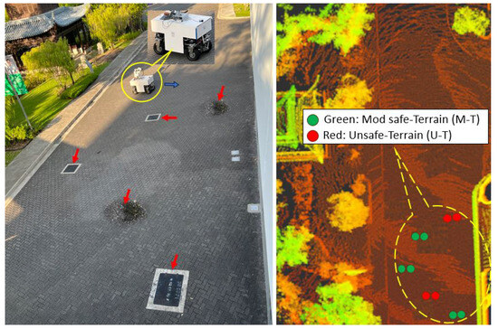 The final case study was focused mainly on representing the system-generated threshold classes. Hence, we selected minimally used pavement with uniformly paved tiles and an area of 10 × 25 m2 for deployment. This area also includes uneven and unstructured spots such as missing or broken tiles, drainage cover at different heights, curbs, small pits, cliffs, gutters, etc. Additionally, some common hard trashes on the road were introduced, such as small stones, rods, bottles, cans, etc., to simulate the actual pavements. The robot was driven in the predefined hard-coded zig-zag path pattern for area coverage in a closed loop. The 3D LiDAR map generated during the prework of the experiment was used along with the hdl-localization algorithm for localization. An intermittent prediction of M-T and U-T classes was observed whenever the robot was exposed to medium and severe terrain features and fused on the 3D-occupancy grid map in real time. This test was planned on average four hours per day, and we continued testing for ten days with no corrective actions on terrain and noticed M-S classes fused occasionally and observed the robot’s vibrations when it traversed through the plain and even terrain. The robot was allowed to continue its operation without any maintenance actions, exposing it to the same unstructured terrain features. Further, the algorithm predicted system-generated unsafe classes (U-S) on the 15th day, and we noticed an obvious vibration in the robot. For the safety of the robot and environment, we stopped the experiment and discovered the hub wheel couplings assembly was getting looser than the original settings, and one of the wheels was punctured. The 3D CbM map with random samples from the last few fused vibration threshold classes is shown in Figure 15, including the test environment photo.