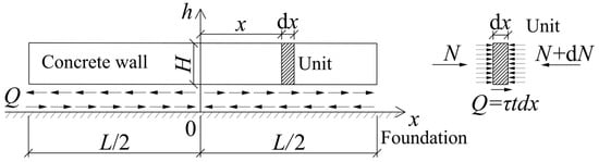 The deformation of a concrete structure is constrained by the foundation. Based on this, a concrete wall model on an elastic foundation is established, as shown in Figure 1. It is assumed that the concrete wall and the foundation are deformable elastic structures, and the constraints between them can be reflected by the relationship between stress and deformation [,].