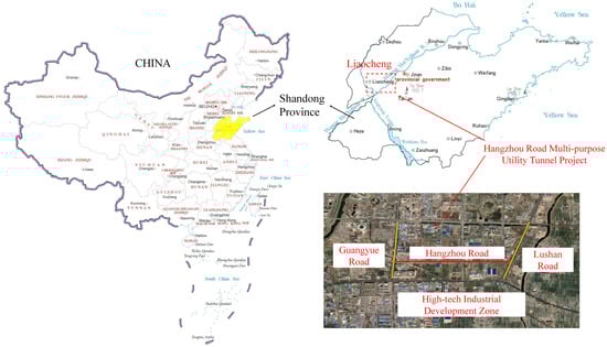 Hangzhou Road multi-purpose utility tunnel is located in Hangzhou Road, High-tech Industrial Development Zone, Liaocheng City (Figure 2). The utility tunnel starts from Guangyue Road in the west and ends at Lushan Road in the east. The Hangzhou Road multi-purpose utility tunnel has a total length of 3162.7 m, with a single-cabin rectangular section and cast-in-site reinforced concrete structure. About 30 m of the tunnel is divided into one construction section, and deformation joints are set in two adjacent sections. The main structure concrete of the utility tunnel adopts self-waterproof C35 concrete. The Quaternary geomorphic units along the proposed tunnel belong to the central part of the Yellow River alluvial plain, with relatively flat terrain and low terrain. The strata are mainly composed of silty clay, silt, and sand.