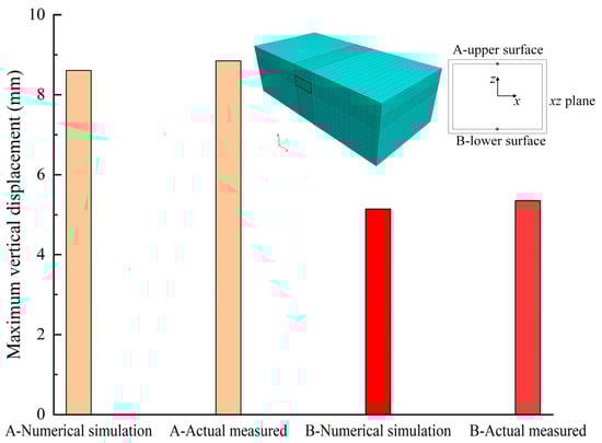 Model validation is an important step to ensure appropriate and acceptable results of computational simulation, which is usually carried out by comparing model simulation data with independent experimental or field datasets [,,]. In Huang [], the vertical displacement of a utility tunnel project in Chongqing was measured. Based on this reference, the same numerical model was established to simulate the tunnel displacements. The length of the tunnel is 8.9 m, the width is 3.9 m, and the buried depth is 4.2 m. The thickness of the tunnel is 0.4 m, the total length is 30 m, the entire model size is 64 m × 30 m × 20 m. Eight-node brick elements are used to simulate the soil and concrete. Figure 3 shows the simulation and measured results of the maximum vertical displacement of the top and bottom of the structure. The error of the maximum vertical displacement between the numerical result and the actual measured value is small, which is less than 10%. Therefore, the numerical model is reliable.