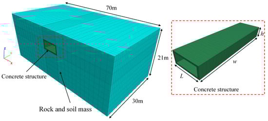 The schematic diagram of the numerical model is shown in Figure 4. Based on the project design drawings, the cross-section of the concrete structure is a rectangle, L = 10 m, h = 4 m, and w = 30 m. The thickness of the structure is D = 0.5 m, buried depth is 5 m. According to Saint Venant’s principle [], the whole model size is 70 m × 21 m × 30 m, which is composed of 32,860 grid points and 29,640 zones. Eight-node brick elements are used to simulate the soil and concrete. All tunnel meshes established in the study adopt the same size. The mesh is divided into 1 m in the longitudinal direction of the tunnel, 0.5 m in the length and height directions, and 0.2 m in the thickness direction.