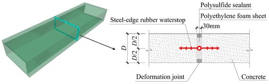 The deep groundwater environment in urban areas is relatively complex. During the operation period of tunnels in urban deep aquifer zones, the surrounding strata of the tunnel are rich in groundwater, and the tunnels are often exposed to the risk of groundwater leakage, resulting in deep and long cracks and large deformations in the tunnel concrete, which seriously threaten the tunnel’s safety. Deformation joints are narrow gaps between various parts of concrete structures, including expansion joints and settlement joints, which can prevent uneven settlement and concrete shrinkage of open-cut cast-in situ concrete structures [,]. They are widely used in tunnels, multi-purpose utility tunnels, subway stations, and other engineering projects. However, as the weak part of the concrete structures, deformation joints increase the risk of water seepage. In deep aquifer zones, nearly 90% of subway stations have leakage problems, and nearly 30% of the leakage occurs at deformation joints [,]. Once water seepage occurs, it will not only reduce the strength of the concrete structure but also bring safety hazards to later operations. To ensure the safety of tunneling operations, a new numerical analysis is required, by means of which the influence of multiple factors in urban deep aquifer zones and deformation joints on structure cracking risk can be reasonably researched.