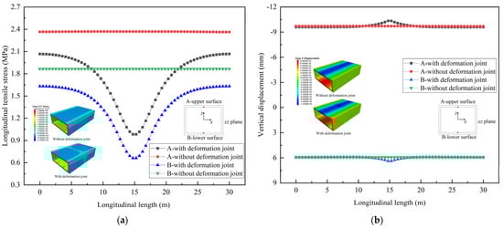 As shown in Figure 6b, the maximum vertical displacement is concentrated at the top and bottom of the structure; the top of the structure subsides, and the bottom of the structure uplifts. When the structure has no deformation joints, the maximum vertical displacement of the upper surface is 9.75 mm, which is greater than that of the lower surface of 5.94 mm. With deformation joints, the vertical displacement changes greatly at the deformation joints, and the maximum vertical displacement of the upper surface is 10.44 mm, which is greater than that of the lower surface of 6.38 mm. Compared with no deformation joints, the maximum vertical displacement of the upper and lower surface increases by 7.1% and 7.4%, respectively.