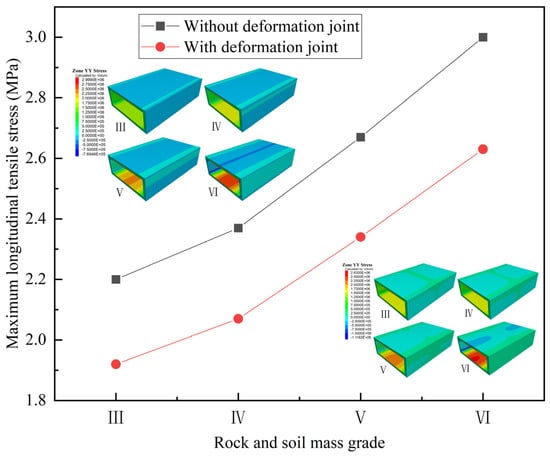 Figure 7 shows the longitudinal tensile stresses of the structure under different rock and soil mass grades. The density of the rock and soil mass directly affects the load of the overlying soil on the structure. At the same time, the better the strength of the rock and soil, the stronger the self-stabilization ability of the rock and soil, and the smaller the additional stress of the overlying soil on the structure. Therefore, as the rock and soil mass grade increases, the maximum longitudinal tensile stress of the structure gradually increases, and the risk of structural cracking increases. The properties of the rock and soil mass around the structure are directly related to the structural stress, which is consistent with the results of Weng et al. [] and Huang et al. []. Without deformation joints, the maximum longitudinal tensile stress under grade VI rock and soil mass is 3.00 MPa, which is 36.4% higher than that under grade III rock and soil mass of 2.20 MPa. With deformation joints, the maximum longitudinal tensile stress under grade III rock and soil mass is reduced to 1.92 MPa, which is a reduction of 12.7%. The maximum longitudinal tensile stress under grade VI rock and soil mass is reduced to 2.63 MPa, which is a reduction of 12.3%.