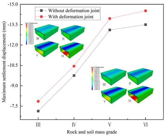 The settlement displacements under different rock and soil mass grades are shown in Figure 8. The same as the influence law of the maximum tensile stress of the structure, the rock and soil mass grades increase, and the maximum settlement displacement of the structure increases. Therefore, by improving the strength properties of the soil around the structure, the settlement displacements can be effectively reduced, and this result is consistent with that of Wang et al. [] and Tan et al. []. Without deformation joints, the maximum settlement value under grade VI rock and soil mass is −13.50 mm, which is 89.3% higher than that under grade III rock and soil mass of −7.13 mm. The deformation growth is relatively obvious. With deformation joints, the maximum settlement value increases by 10.1% under grade III rock and soil mass. The growth magnitude of the maximum settlement value gradually decreases while the rock and soil mass grade increases.