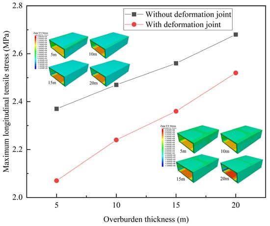 In previous numerical studies [,,,,,], there have been few studies on the impact of overburden thicknesses on the structural cracking risk. Figure 9 shows the longitudinal tensile stresses of the structure under different overburden thicknesses when the grade of rock and soil mass is IV. The overburden thickness directly affects the load of the upper soil on the structure, so as the overburden thickness increases, the longitudinal tensile stress of the structure increases, and the risk of structural cracking increases. Without deformation joints, the maximum longitudinal tensile stress increases by 13.1% as the overburden thickness increases from 5 m to 20 m, which indicates that overburden thicknesses have a relatively small influence on structural cracking. With deformation joints, the maximum longitudinal tensile stress is reduced by 12.7% under an overburden thickness of 5 m. The decreased magnitude of longitudinal tensile stress gradually decreases as the overburden thickness increases.