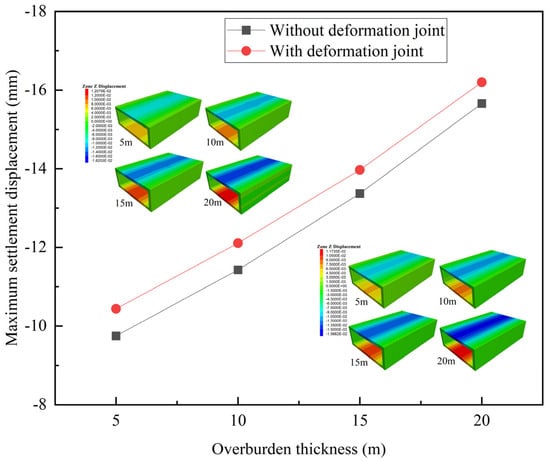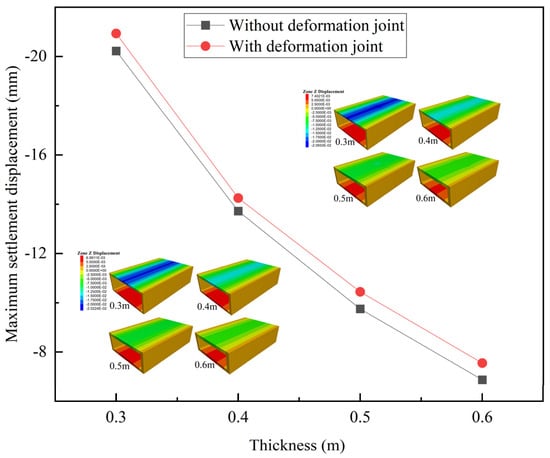In Figure 16, when without deformation joints, the ability of the structure to resist deformation increases as the structure thickness increases [,]. The maximum settlement displacement of the structure decreases by 66.0% as the structure thickness increases from 0.3 m to 0.6 m, with a significant change. With deformation joints, the maximum settlement displacement increases by 9.9% under a structure thickness of 0.6 m. The change magnitude of the maximum settlement displacement increases with the increase in structure thickness.