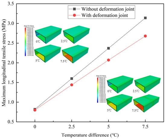 With deformation joints, the maximum longitudinal tensile stress of the structure increases by 2.35 times as the temperature difference increases from 0 °C to 7.5 °C. The deformation joints can effectively reduce the influence of temperature differences on the structural tensile stress, which is consistent with the results of Dong et al. []. Compared with no deformation joints, the maximum longitudinal tensile stress is reduced by 2.4% under a temperature difference of 0 °C, and 14.6% under a temperature difference of 7.5 °C. The greater the temperature difference, the greater the reduction magnitude of the longitudinal tensile stress, and the more significant the effect of deformation joints.