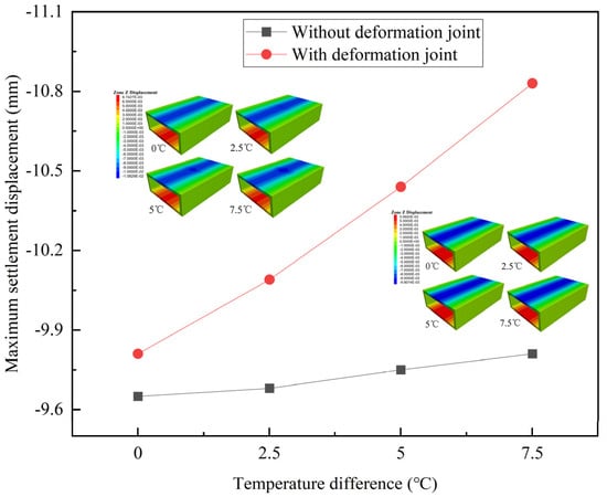 Figure 12 shows the settlement displacements of the structure under different temperature differences. Without deformation joints, as the temperature difference increases from 0 °C to 7.5 °C, the maximum settlement displacement of the structure increases by 1.7%, and temperature difference has little effect on structural settlement displacement, and this result is consistent with that of Huang et al. []. With deformation joints, the maximum settlement value of the structure increases by 10.4% as the temperature difference increases from 0 °C to 7.5 °C. Compared with no deformation joints, the larger the temperature difference, the greater the growth magnitude of structural deformation.