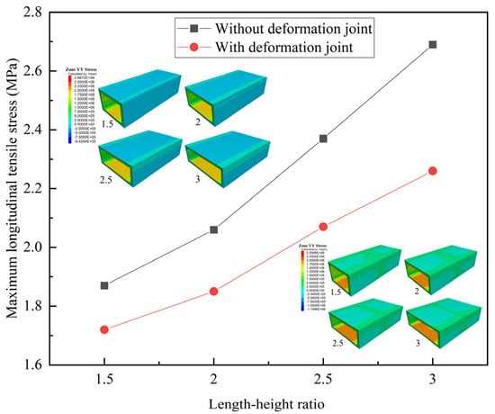 Figure 13 shows the longitudinal tensile stresses of the structure under different length–height ratios when the height of the structure is 4 m. With the increase in the length–height ratio, the longitudinal tensile stress of the structure increases, and the risk of structural cracking increases, which is consistent with the influence law presented in He et al. []. However, in his research, there was no quantitative analysis of the influence degree of structural length–height ratios. Without deformation joints, the maximum longitudinal tensile stress of the structure increases by 43.9% as the length–height ratio increases from 1.5 to 3. With deformation joints, the maximum longitudinal tensile stress is reduced by 16.0% under a length–height ratio of 3. As the length–height ratio increases, the decreased magnitude of longitudinal tensile stress increases gradually.