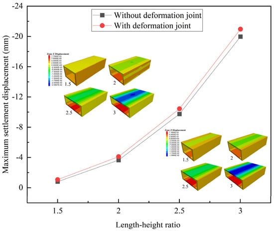 In Figure 14, with the increase in the length–height ratio of the structure, the settlement displacement increases from −0.80 mm to −19.97 mm, and the increment is very significant. With deformation joints, the maximum settlement displacement increases. The larger the length–height ratio, the smaller the deformation growth rate.