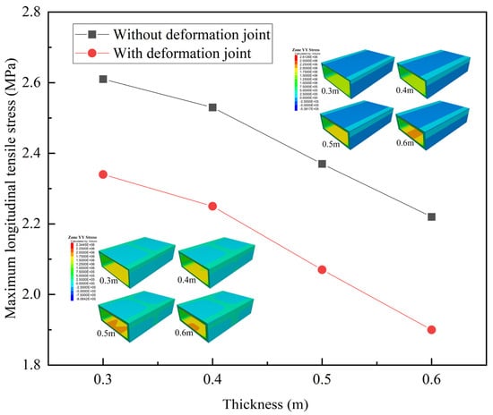 Figure 15 shows the longitudinal tensile stresses under different structure thicknesses when the length–height ratio of the structure is 2.5. The greater the structure thickness, the smaller the longitudinal tensile stress of the structure, which is consistent with the influence law presented by Equation (14) and Liu et al. []. Without deformation joints, the maximum longitudinal tensile stress of the structure decreases by 14.9% as the structure thickness increases from 0.3 m to 0.6 m. With deformation joints, the maximum longitudinal tensile stress is reduced by 14.4% under a structure thickness of 0.6 m. The greater the thickness of the structure, the greater the reduction magnitude of the longitudinal tensile stress.