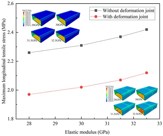 Figure 17 shows the the longitudinal tensile stresses under different concretes when the length–height ratio of the structure is 2.5 and the structure thickness is 0.5 m. With the increase in the elastic modulus, the longitudinal tensile stress of the structure increases, mainly because the elastic modulus is positively correlated with the temperature stress of concrete [,]. Without deformation joints, the maximum longitudinal tensile stress of the structure increases by 7.1% as the elastic modulus increases from 28 GPa to 32.5 GPa. With deformation joints, the maximum longitudinal tensile stress is reduced by 12.8% under an elastic modulus of 28 GPa, and 12.4% under an elastic modulus of 32.5 GPa.