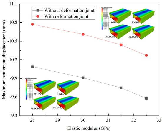 In Figure 18, when without deformation joints, the elastic modulus of the structure increases, and the ability of the structure to resist deformation increases. The maximum settlement displacement of the structure decreases by 5.1% as the elastic modulus increases from 28 GPa to 32.5 GPa. With deformation joints, the maximum settlement displacement increases by 7.2% under an elastic modulus of 32.5 GPa. The growth magnitude of the maximum settlement displacement increases with the increase in the elastic modulus.