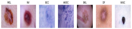The study utilized a collection of skin cancer images obtained from various regularly updated sources. Specifically, the skin cancer images used were sourced from the HAM10000 dataset, comprising a total of 10,500 samples [47,48]. A single lesion in this dataset is represented in multiple images acquired at different times and under different lighting conditions, which further contributes to the variability in the data. The HAM10000 dataset encompasses a comprehensive representation of significant diagnostic categories within the domain of pigmented lesions (shown in Figure 1).
