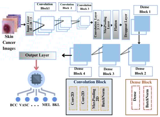 Computer-aided design (CAD) systems may enhance the efficiency and accuracy of skin cancer diagnosis by providing an automated and objective approach to analyzing lesions on the skin [8,9,10]. Dermatologists and other healthcare professionals can use them to leverage the power of computer vision and machine learning techniques to assist in the early detection and prompt treatment of skin cancer, ultimately improving the health of their patients [3,9]. An inherent limitation of CAD is the manual selection of features based on human intuition and expertise. The system may fail to recognize relevant features that are not readily apparent to human observers, resulting in decreased diagnostic accuracy. By selecting features manually, a limited feature set may be selected that is not sufficiently comprehensive to capture the complex and diverse features of skin lesions [11,12]. A CAD system may suffer from decreased classification accuracy if important features are missed during the selection process. Furthermore, CAD systems heavily rely on training data in order to develop and fine-tune their algorithms [13,14,15]. CAD systems may have difficulty generalizing well to real-world scenarios if the training dataset is biased or does not represent the diverse population and skin lesions of a particular region. Consequently, when applied to cases that are unfamiliar or difficult to classify, the classification accuracy may be reduced [11,16]. The detection of skin cancer from images has become an increasingly important area of research and medical practice as a result of advances in deep learning. Using deep networks, it is possible to learn representations of input data that are extremely complex and abstract [11,13,15]. The architecture of convolutional neural networks (CNNs) often consists of multiple layers with deep architectures. These deep architectures allow CNNs to capture both low-level and high-level features, allowing them to extract meaningful information from images with varying qualities, lighting conditions, and perspectives. Additionally, a CNN is capable of learning relevant features automatically from raw data, eliminating the need for manual selection of features [12,15]. CNNs can capture intricate patterns and subtle features necessary for accurate classification by learning hierarchical representations of the input images [17,18,19]. The complexity of the CNN architecture, however, can significantly influence the training time. Training deeper networks with more layers and parameters generally takes longer and requires more computational power [20,21]. In addition, CNNs may be prone to overfitting, particularly when the model is complex and trained on a limited amount of data [20,21]. Furthermore, the tuning of models’ hyperparameters, such as learning rate, batch size, and regularization, typically requires multiple training iterations [22]. The duration of the overall training process may be extended as a result of this iterative process [20,21,22].