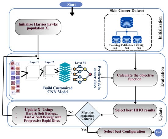 An AI model consists of three basic components: data, network architecture, and its parameters. An optimal balance between these elements is essential for maximizing the efficiency of a deep learning model. A random initial set of parameters is used for each trial of the model, and the model’s performance is evaluated in each trial to ensure that it is suitable for use. When performing complex tasks such as multiple skin cancer detection, the incorrect selection of the model’s hyperparameters can lead to suboptimal results, and traditional trial and error approaches can take a long time to tune hyperparameters and analyze results. Therefore, optimizing hyperparameters based on training data is crucial to finding the best values. In HHOForSkin, we use the Harris hawk optimization (HHO) algorithm, which is a metaheuristic method based on Harris’s hawks’ hunting behavior to solve the multiple skin cancer optimization problem.